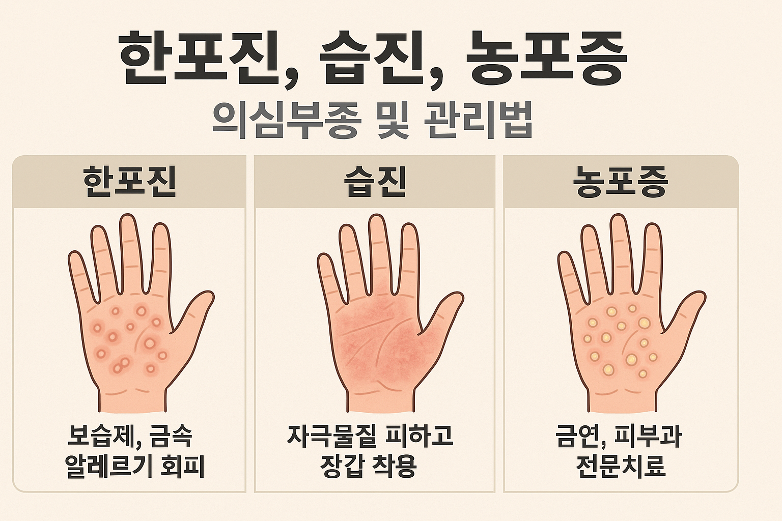 물집이 생기고 가려움이 동반되는 손 피부질환은 하나의 병으로 단정하기 어렵습니다. 특히 한포진, 습진, 농포증은 모두 유사한 부위에 비슷한 증상으로 나타나 혼동되기 쉬운데요, 각각의 질환은 원인과 치료법이 다르기 때문에 정확한 이해가 필요합니다. 이 글에서는 손과 발에서 흔히 나타나는 대표적인 세 가지 피부질환의 차이를 정리하고, 증상별로 어떻게 구별하고 관리해야 하는지를 소개합니다. 일상에서 자주 접하는 질환이지만, 잘못된 자가 진단으로 치료 시기를 놓치지 않도록 주의가 필요합니다.