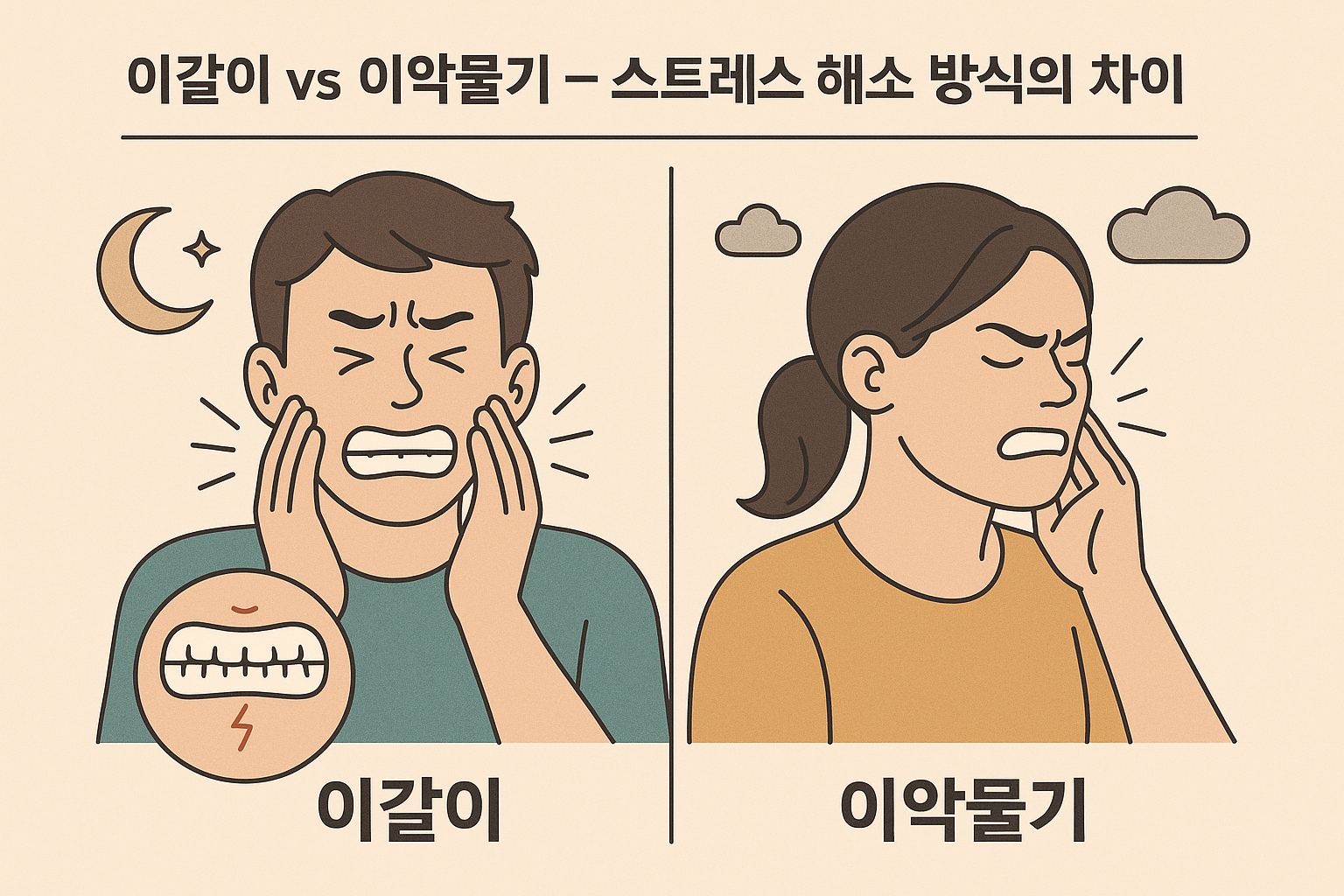 무의식 중에 턱에 힘이 들어가거나, 아침에 일어났을 때 턱이 뻐근하거나 이가 시린 경험이 있으신가요? 이러한 증상은 단순히 습관이라 치부되기 쉽지만, 실제로는 우리 몸과 마음이 스트레스에 반응하는 방식 중 하나일 수 있습니다. 특히 이갈이(bruxism)와 이 악물기(clenching)는 비슷해 보이지만, 발현 시기, 원인, 신체 반응 방식, 건강에 미치는 영향까지 전혀 다르다는 점에서 구별할 필요가 있습니다. 이 글에서는 이 두 현상을 각각의 특성과 스트레스와의 연관성, 관리법에 초점을 맞춰 살펴보고자 합니다.